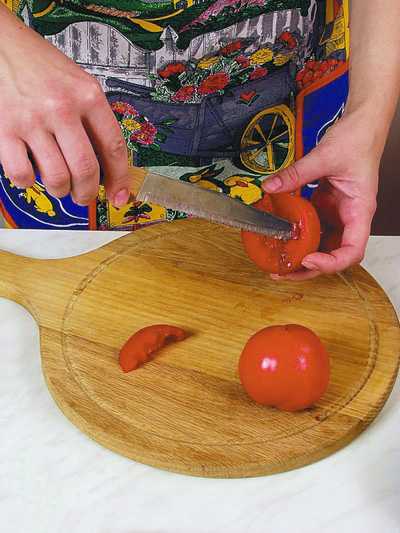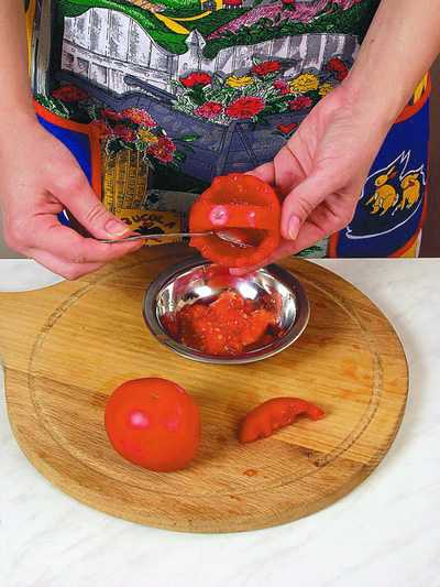 Вырезать из помидора одну четвертинку, затем аккуратно удалить сердцевину.