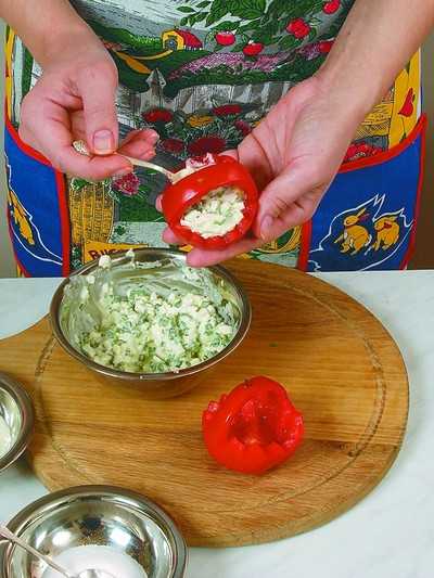 Желтый болгарский перец разрезать пополам, удалить семена, половину нарезать кубиками.