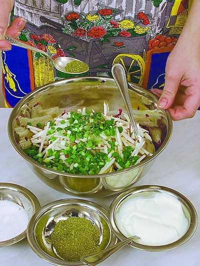 70 г краснокочанной капусты, 1 среднего размера клубень картофеля, 2 маринованных огурца, 2 яйца, 1/2 луковицы, 2 ст. ложки растительного масла, 1 ст. ложка лимонного сока, листья салата, зелень укропа, сахар, соль, пряности.