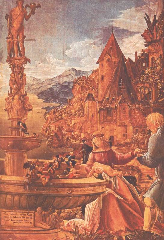 Одна из самых ранних дошедших до нас работ мастера – «Отдых на пути в Египет» (1510, Картинная галерея Берлин-Далем, Берлин). Уже в этой картине видна неповторимая художественная манера Альтдорфера. Автор трактует христианскую легенду как обычный бытовой сюжет, в то же время вплетая его в обстановку чудесной сказки. Воображение живописца поместило Святое семейство возле красивого фонтана, в центральной части которого большая скульптура. Маленькие ангелочки плещутся в чаше, младенец на руках матери тянется к воде. Седой крестьянин (Иосиф) подает Марии корзинку с вишнями. Трогательная сцена происходит на фоне пейзажа, в котором соединились черты реальности и вымысла. Деревенский домик с полуразрушенной крышей, высокая башня за ним – все как будто написано Альтдорфером с натуры. Скалистый берег, поросший деревьями, уходящая вдаль река похожи на фантастический мираж.