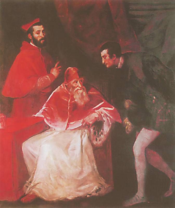 Таков «Портрет Папы Павла III с Алессандро и Оттавио Фарнезе» (1545–1546, музей Каподимонте, Неаполь). На первый взгляд эта работа напоминает портрет Папы Юлия II кисти Рафаэля. Однако при более внимательном изучении ощущается глубокое различие между двумя этими картинами. Юлий II выглядит спокойным, его руки неподвижно и уверенно лежат на подлокотниках кресла, лицо сосредоточенно, в глазах можно прочитать легкую задумчивость.