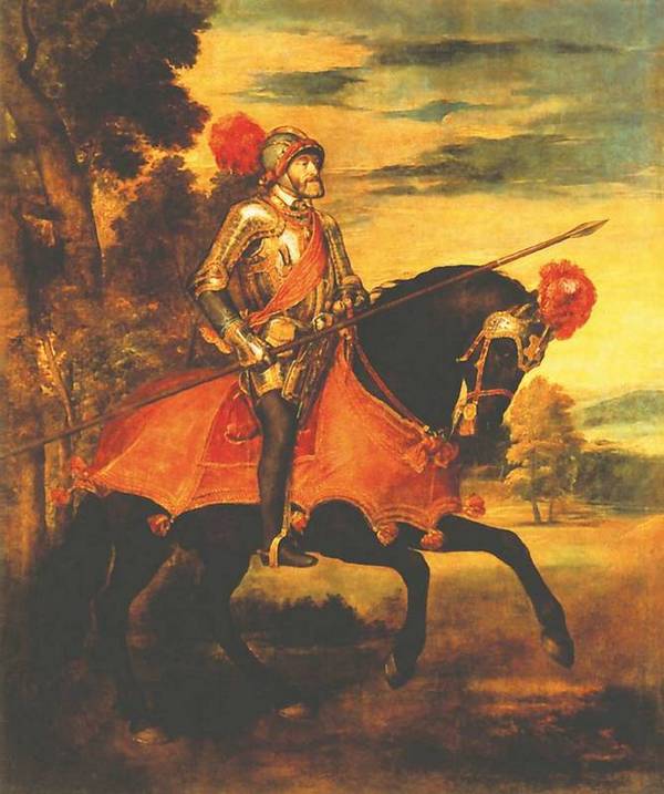 На картине «Император Карл V под Мюльбергом» (1548, Прадо, Мадрид) Тициан показал его на коне, в доспехах, с копьем в руках, на фоне пейзажа, на рассвете, перед началом битвы. Эту работу, в отличие от предыдущей, можно отнести к официальным барочным портретам. Поза Карла V говорит о том, что он полон решимости, уверен в победе.