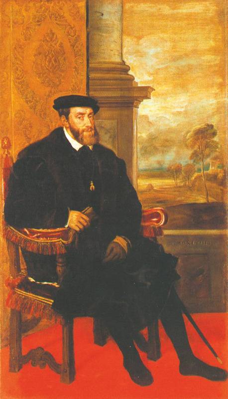 В 1548 году Тициан выполнил два портрета Карла V. На первой картине император изображен, как впоследствии на официальных портретах эпохи барокко, сидящим в кресле. Однако в этой работе нет ничего от льстивого прославления величия монарха. Наоборот, художник постарался показать внутренний мир не правителя, а обыкновенного человека, а также свое отношение к нему как к государственному лидеру. Взглянув на картину, зритель видит постаревшего, уставшего, больного и одинокого человека. В его взгляде читается печаль и отрешенность. Эта картина хранится в Старой пинакотеке в Мюнхене.