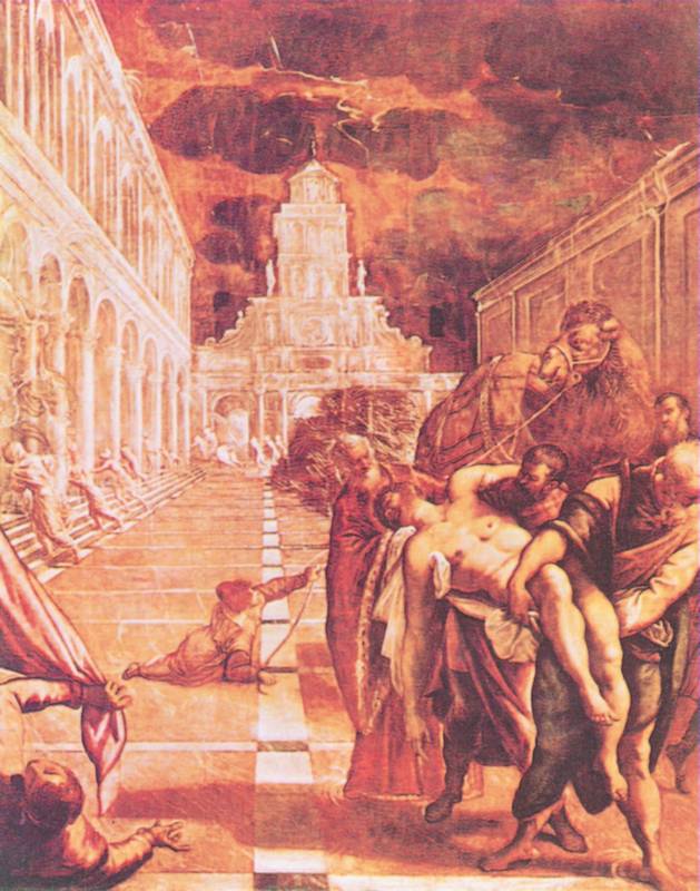 Наибольший интерес представляет вторая картина, имеющая некоторое отношение к историческому жанру. Основой для нее послужили реальные события, согласно которым тело (по легенде: одного из четырех евангелистов, Марка) было похищено и некоторое время находилось в Александрии, городе «неверных». В 828 году мощи св. Марка были возвращены в Венецию и хранились в соборе Сан-Теодоре, а затем в специально построенном для этого соборе Сан-Марко.