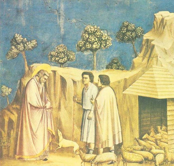 На одной из фресок Джотто изобразил эпизод из жизни Иоакима: приход к пастухам. Иоаким – уже глубокий старик с седыми волосами и бородой, одетый в просторный плащ, собирающийся в складки на спине и груди. Поняв, что у него никогда не будет детей, он покинул свой дом, жену Анну и отправился к пастухам, чтобы провести остаток жизни с ними. Пастухи – молодые мужчины в длинных, подпоясанных белых рубахах встречают Иоакима у входа в жилище, которое больше напоминает пещеру.