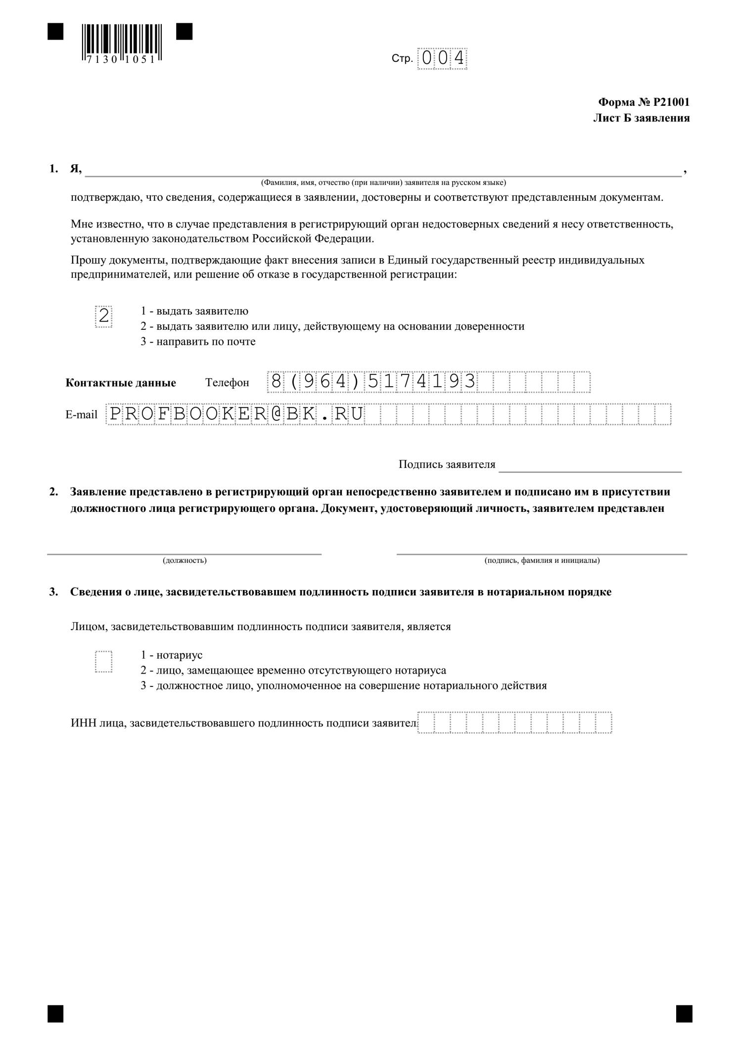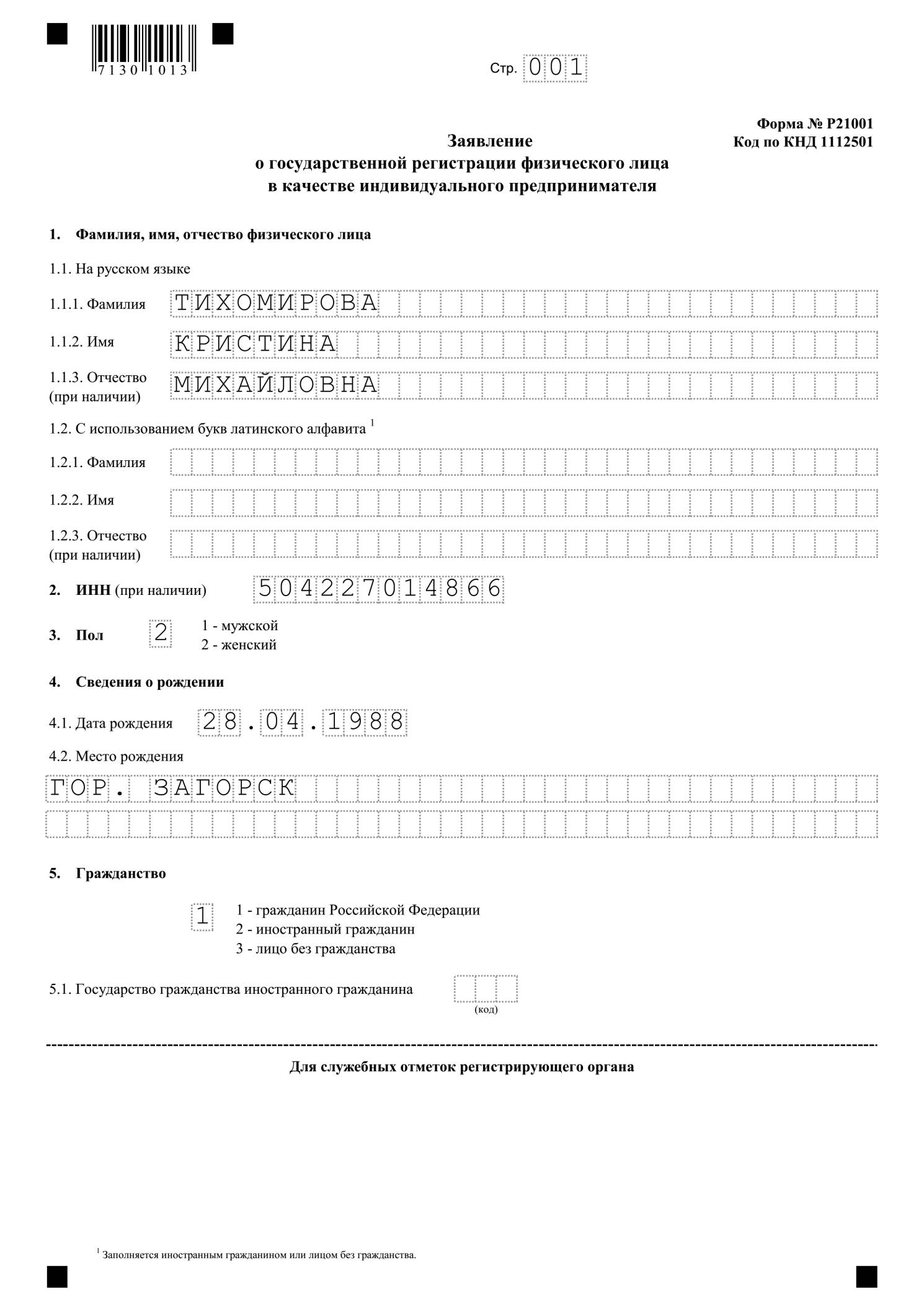 –Заявление о государственной регистрации физического лица в качестве индивидуального предпринимателя (форма № Р21001);