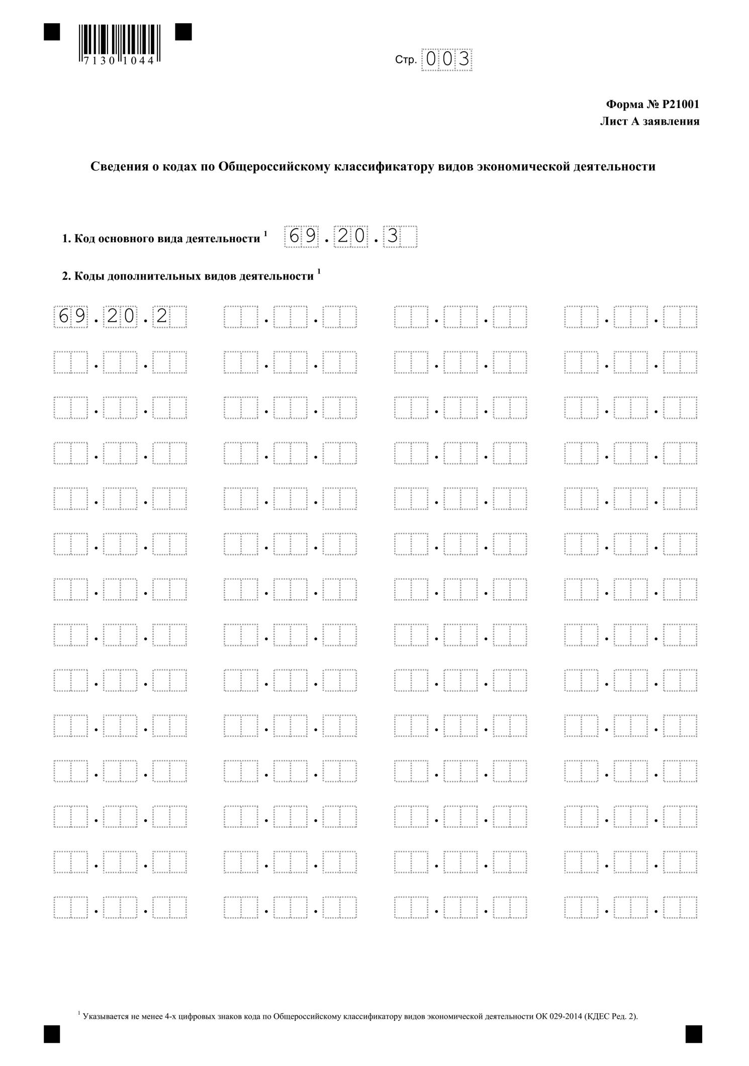 На листе А заявления вносим коды ОКВЭД видов деятельности, которые мы с Вами отобрали. Дополнительные коды вносятся построчно слева направо.