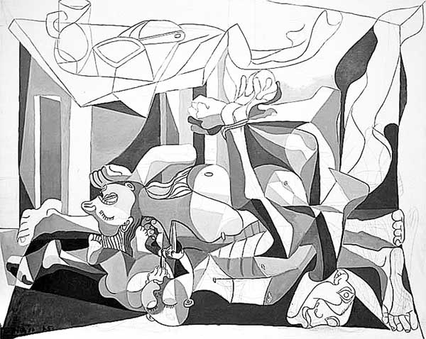 Речь идет о картине 1945 года «Братская могила». Она была написана в память о жертвах Второй мировой войны и действительно не была завершена. Пикассо не смог закончить ее к Осеннему салону 1945 года. И хотя она была выставлена на экспозиции «Искусство и Сопротивление» в феврале 1946-го, завершенной автор ее все равно не считал.