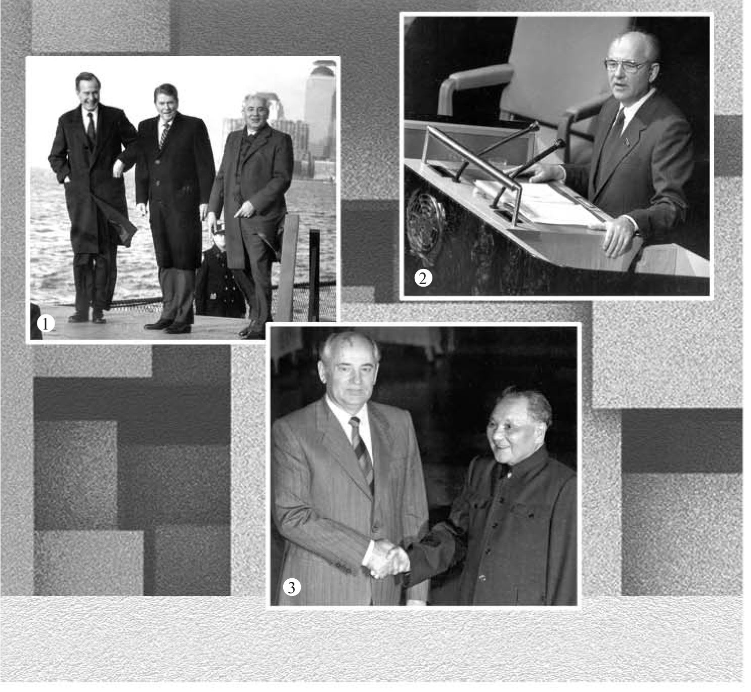 1. Встреча на Говернорс-айленд в Нью-Йорке. Вице-президент США Дж. Буш-старший, Президент США Рональд Рейган, Михаил Горбачев 7 декабря 1988 г.
