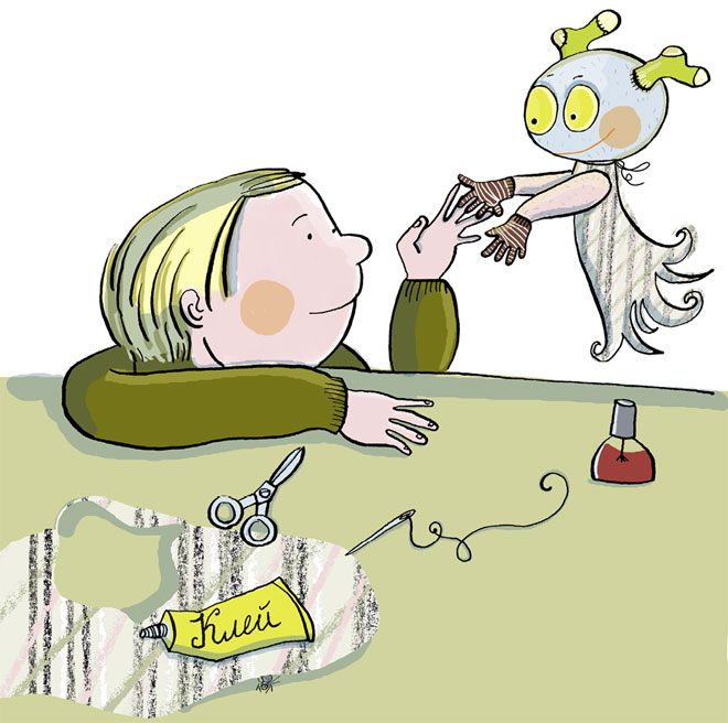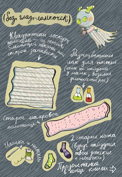 К голове Йоши пришил два маленьких носочка – получились уши. Маминым алым лаком для ногтей нарисовал рот – от уха до уха. А зеленым лаком – глаза. Из ящика для рукоделия Йоши взял кусок тюля и сделал из него длинную рубашку.