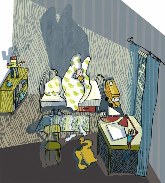 Йоши вернулся в свою комнату. Маленький Страшилка больше не храпел под одеялом, а сидел на корточках и причитал: