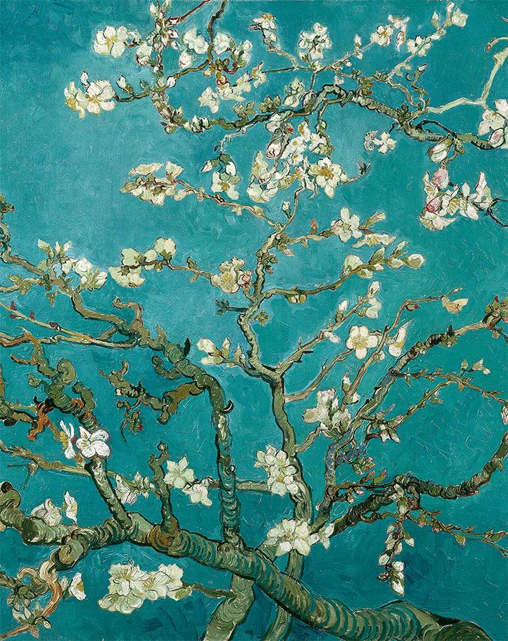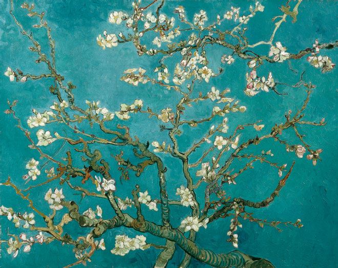 Порыв в синеву. Цветы миндального дерева устремляются в небо. Ничего, кроме белых лепестков и лазурно-голубого цвета. Воплощение счастья, сильного и хрупкого, как жизнь. На протяжении своей короткой, восхитительной и молниеносно пролетевшей жизни Ван Гог, истощенный царившим в его душе хаосом и борьбой с душевной болезнью, здесь сосредоточивается на главном – на порыве жизни. Он выходит за рамки пейзажа, отбрасывает все лишнее, даже ствол дерева, чтобы сконцентрироваться на сочетании крайностей: цветках миндаля и небе, голубом и белом, смертном и вечном, земном и небесном… Он как будто отринул свои страдания, чтобы навсегда передать нам ощущение счастья от цветущего миндаля.