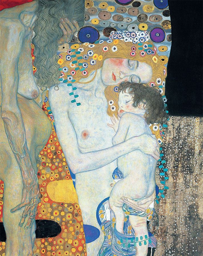 Дитя прижимается к матери. Оба заснули в нежном и трогательном объятии. Прильнув к скудной материнской груди, младенец как будто насыщается той, что дала ему жизнь, ее теплом и любовью. Как всегда у Климта, самые фантастические декоративные детали сродни гиперреалистичным. Посмотрите на мизинец ребенка, оттопыренный так, словно он хочет охватить еще больше теплого и нежного материнского тела. Посмотрите на его взлохмаченные волосы, спутанные и слипшиеся во сне от пота. Он уткнулся головой в ее плечо, чтобы еще больше слиться с матерью. Посмотрите, каким мирным выглядит ребенок и как мать бережет его сон: должно быть, ей не очень удобно от того, как лежит его голова, но она защищает ребенка, обнимая его своей тонкой рукой. Она питает его любовью, сердце к сердцу, и передает ему нечто большее, голова к голове: это дитя – ее прошлое и будущее.