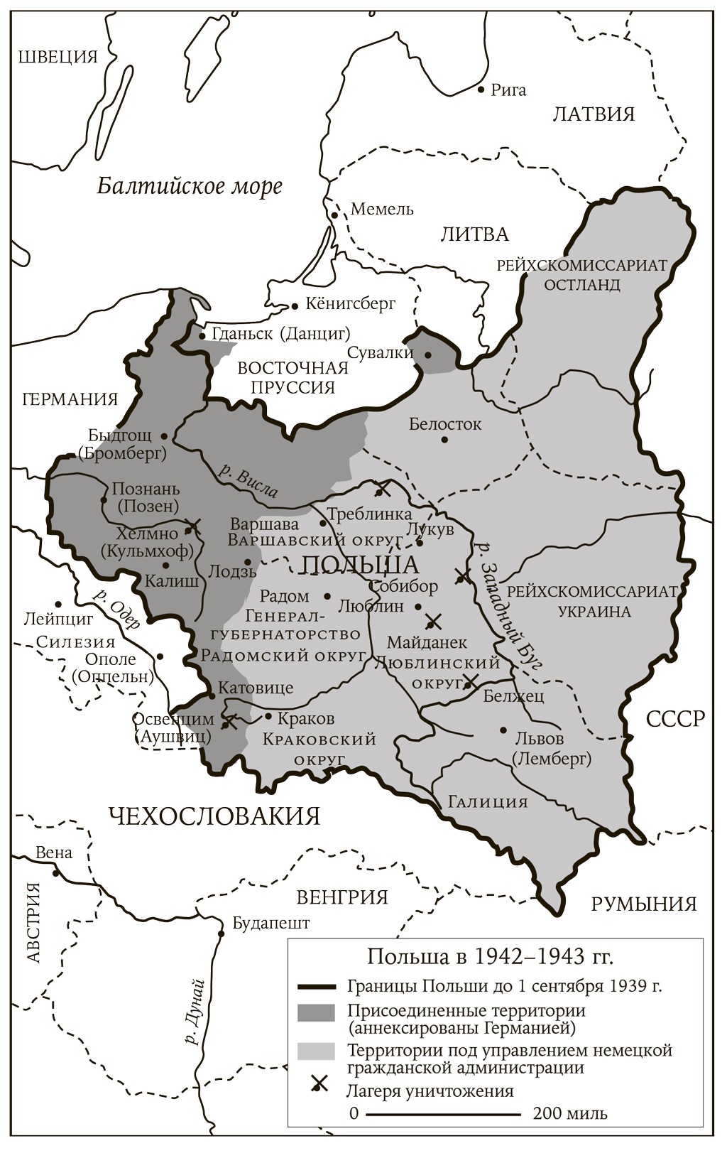 Но если наступление немецкой армии в 1942 году в конечном итоге потерпело неудачу, то блицкриг против евреев, особенно в Польше, достиг своей цели. Нам давно известно, как именно их убивали в крупных гетто, прежде всего в Варшаве и Лодзи. Но большинство польских евреев проживало в небольших городках и поселках, где они зачастую составляли более 30%, а в некоторых случаях даже 80 или 90% жителей. Каким же образом нацистам удалось организовать истребление столь широко распространенного еврейского населения? И откуда в решающий период войны они смогли взять людские ресурсы для реализации этой масштабной задачи? Личный состав, обслуживавший лагеря смерти, был совсем немногочислен. Для «зачистки» небольших гетто – для того чтобы изолировать, а затем либо депортировать, либо расстрелять основную массу польского еврейства, – требовалось гораздо больше исполнителей{1}.