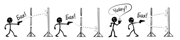 – Так вот, иногда атом проскакивает через щель слева, а иногда – через щель справа. Но самое интересное вот что: когда никто не смотрит, атом проскакивает через обе щели одновременно.