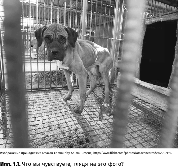 Например, вы наверняка хоть раз видели рекламу типа такой: на экране под очень грустную музыку появляется известная певица, затем нам показывают грязных, израненных, истощенных котят и щенков. Возникает ощущение, будто бедные зверюшки на волоске от смерти. Но тут вам снова показывают певицу, на этот раз в окружении здоровых животных, которых она с улыбкой гладит. Что все это значит? Всего за несколько долларов из вашего кошелька умирающие от голода котята и щенки превратятся в здоровых и счастливых. Кадр из такой рекламы вы найдете на илл. 1.1.