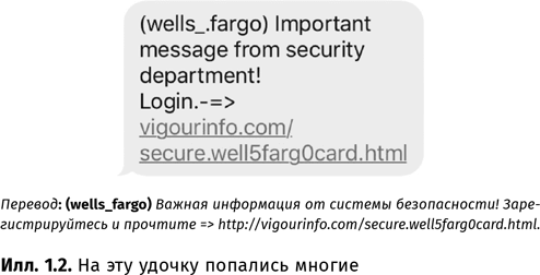 СМС-мошенничество (SMiSHing), или фишинг с использованием текстовых сообщений. Когда в 2016 году атаке подверглась банковская компания Wells Fargo, я получил СМС-сообщение, скриншот которого изображен на илл. 1.2.