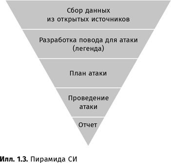 Согласно плану, намеченному в пирамиде, вторая глава («Видите ли вы то, что вижу я?») посвящена сбору данных из открытых источников. В ней описаны техники, которые остаются актуальными независимо от времени. Я старался не слишком углубляться в описание специальных инструментов, хотя все же упомянул те, которые использовал на протяжении последнего десятилетия.