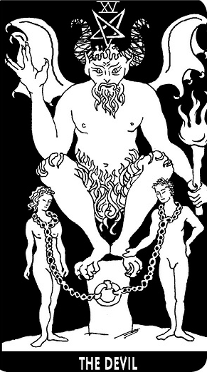 Большинство людей смотрят на карту и полагают, что являются фигурами, порабощенными Дьяволом. Ведьма или колдун, смотря на карту, понимают, что мы свободны, что наш путь освещен. Принять карту Дьявол – означает познать, что вы подобны черной овце в стаде. Вы упрямая и непослушная овца, которая идет поперек общего пути, но в согласии со своим сердцем и волей. Астрологически этой картой управляет знак зодиака Козерог, что означает, что она имеет ту же энергию и те же качества, что и Козерог. Козерог – очень ответственный знак, выполняющий свои обязательства и свой долг по отношению к себе и другим. Высшее проявление Козерога – быть лидером, проводником для других, поступать по-своему. Власть Дьявола исходит от Духа. Дьявол учит нас, как работать с перевернутой пентаграммой, поскольку он уже изменил ее положение. Он связан с самыми глубинными уровнями Духа, и благодаря этой связи он свободен и следует к своей истинной цели.