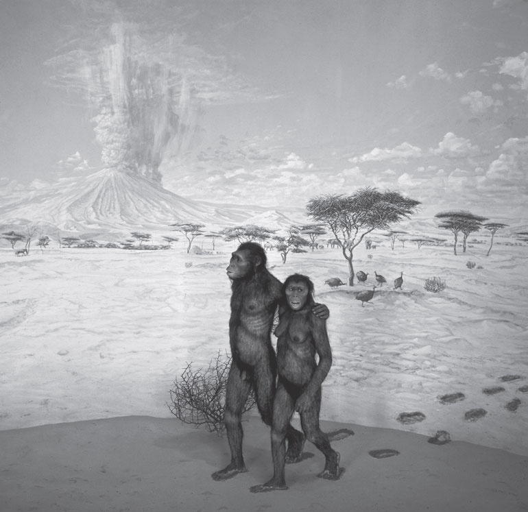 Художественная реконструкция австралопитеков, идущих по мягким вулканическим почвам в Лэотоли (Танзания) 3,6 миллионов лет назад