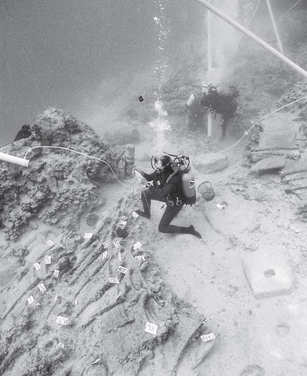 Рис. 1.11. Раскрытие медных чушек на месте кораблекрушения времен бронзового века у Улубуруна на юге Турции. На корабле, датированном XIV веком до н. э., находились предметы со всей Юго-Западной Азии, что свидетельствует о международном характере торговли в восточном Средиземноморье