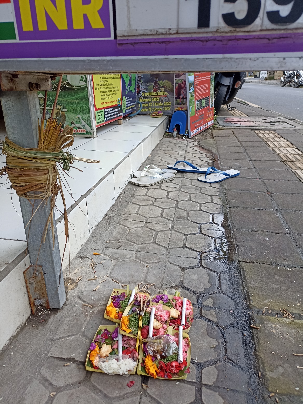 Подношения для злых духов располагаются прямо на тротуарах улиц. С балийской точки зрения, с демоническими существами можно справиться, подкармливая их, размещая на земле подношения для них, в которые кладут еду. Считается, что эти существа любят крепкий кофе (не потому ли мне давали самый крепкий кофе, какой можно себе представить?) или пальмовый самогон. В состав подношений для злых духов входят сигареты. Наверно, злые духи любят курить.
