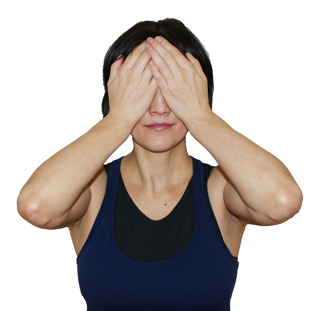 Глаза открыты, положить ладони на глаза, как показано на рисунке. На глаза не надавливать, расслабить и прикрыть веками. Направить поток энергии из рук в глаза, набирать энергию столько, сколько необходимо. При расслаблении глаз должен появиться чёрный фон. Здесь могут быть разные цветовые реакции, плюс работает сила мысли.