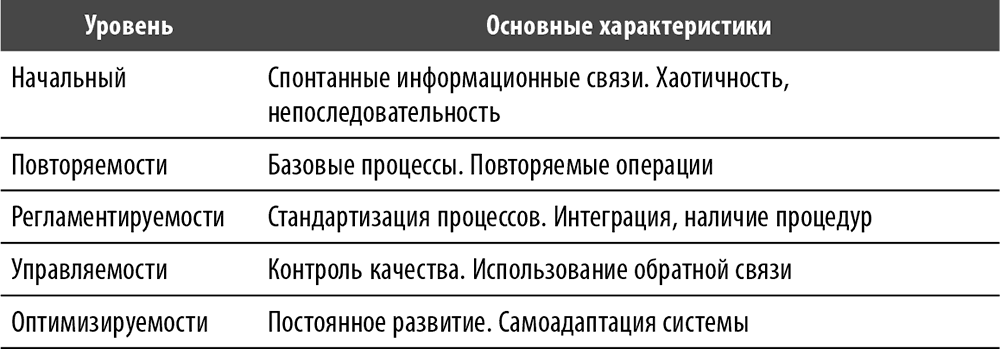• Степень организационной зрелости компании. Чем более зрелой является компания в организационном смысле, тем собраннее и целенаправленнее ее действия. Более зрелые компании имеют более высокий организационный КПД и производят меньше, так сказать, процессного шума, т. е. бесцельных и беспорядочных действий при осуществлении процессов. Возьмем одну из самых популярных классификаций уровней организационной зрелости, созданную на основе CMM (Capability Maturity Model) (см. табл. 1). Как видно из таблицы, степень организационной зрелости определяется именно подходом к организации процессов. Смею предположить, что большинство компаний в России зависли где-то между уровнем повторяемости и регламентируемости.