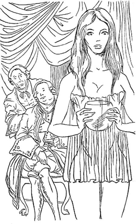 – Все сели. Прошло пять или шесть минут, потом с другой стороны перегородки медленно приподнялся черный занавес и явилась женщина. Это была Антония Верди. Она показалась мне молодой и очень хорошенькой. На ней была надета туника, не закрывающая слишком много сверху и очень короткая снизу, – словом, весьма неблагопристойная. Длинные и великолепные черные волосы струились по обнаженным плечам. Она подошла к столу и пустила на воду хрустальной чаши что-то такое, чего я не мог хорошенько рассмотреть. Регент сидел возле меня. Он наклонился и шепнул мне: