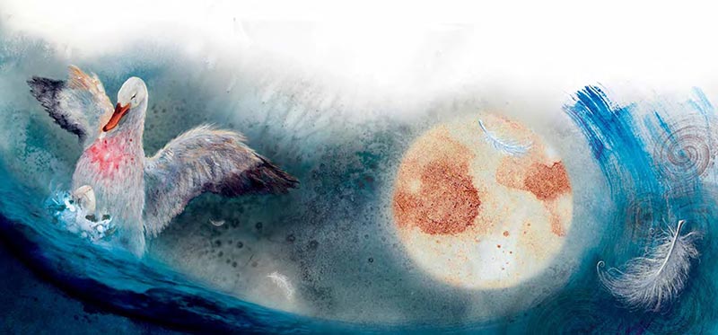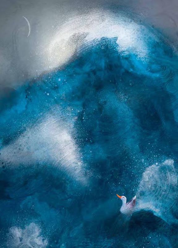 Уточка дрожала от холода и боли, но продолжала свою работу. Её гнездо получилось крошечным и хлипким. Волны бросали его из стороны в сторону, грозясь разрушить или проглотить, но птица вцепилась в него клювом так крепко, что никакая сила не смогла бы отнять у неё этот клочок перьев и пуха. С величайшей осторожностью она положила на хлипкую эту опору тёплое, только что появившееся яйцо и, накрыв его собой, наконец обрела покой. Утка уснула крепким сном. Во сне она видела своего утёнка.