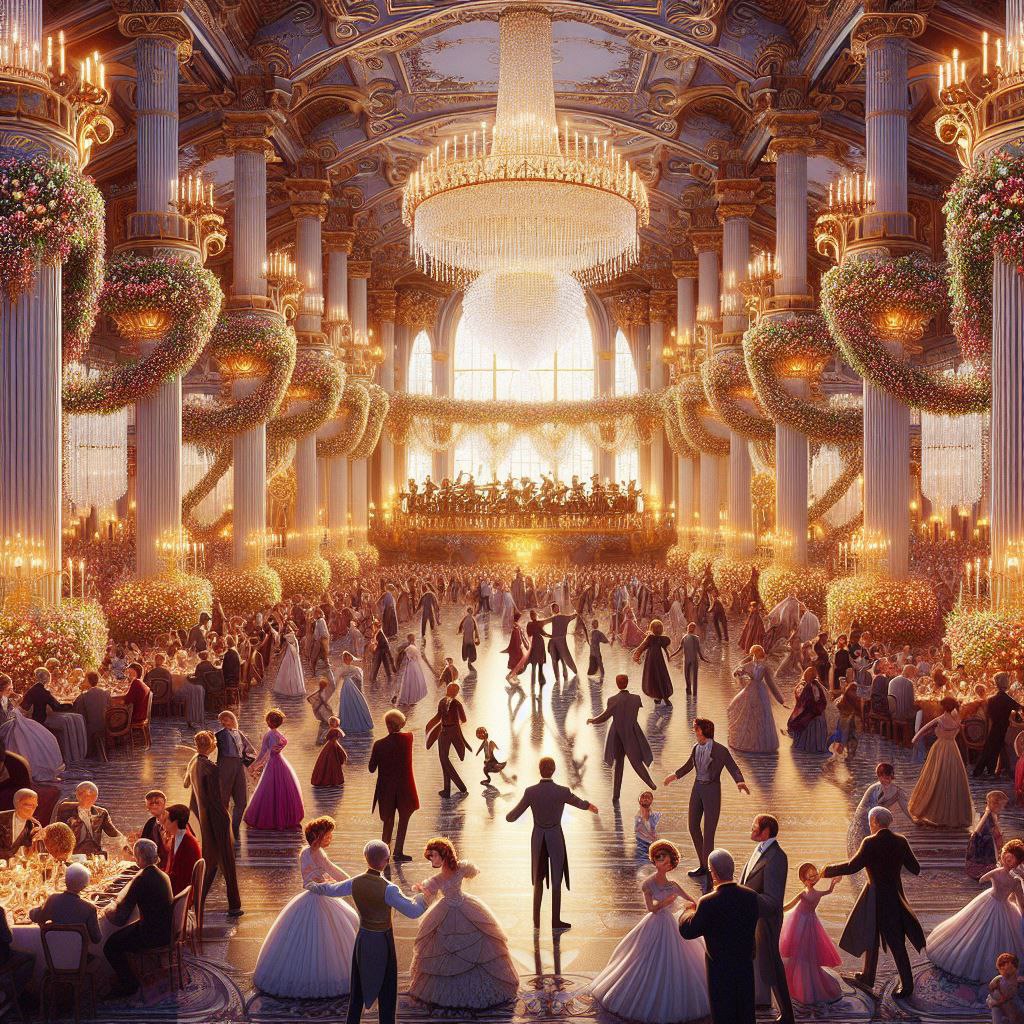 Зал был огромным и празднично украшен. Высокие колонны обвивали гирлянды из живых цветов, а с потолка свисали хрустальные люстры. Гости в нарядных костюмах танцевали под звуки оркестра. Лиза затаила дыхание от восхищения.