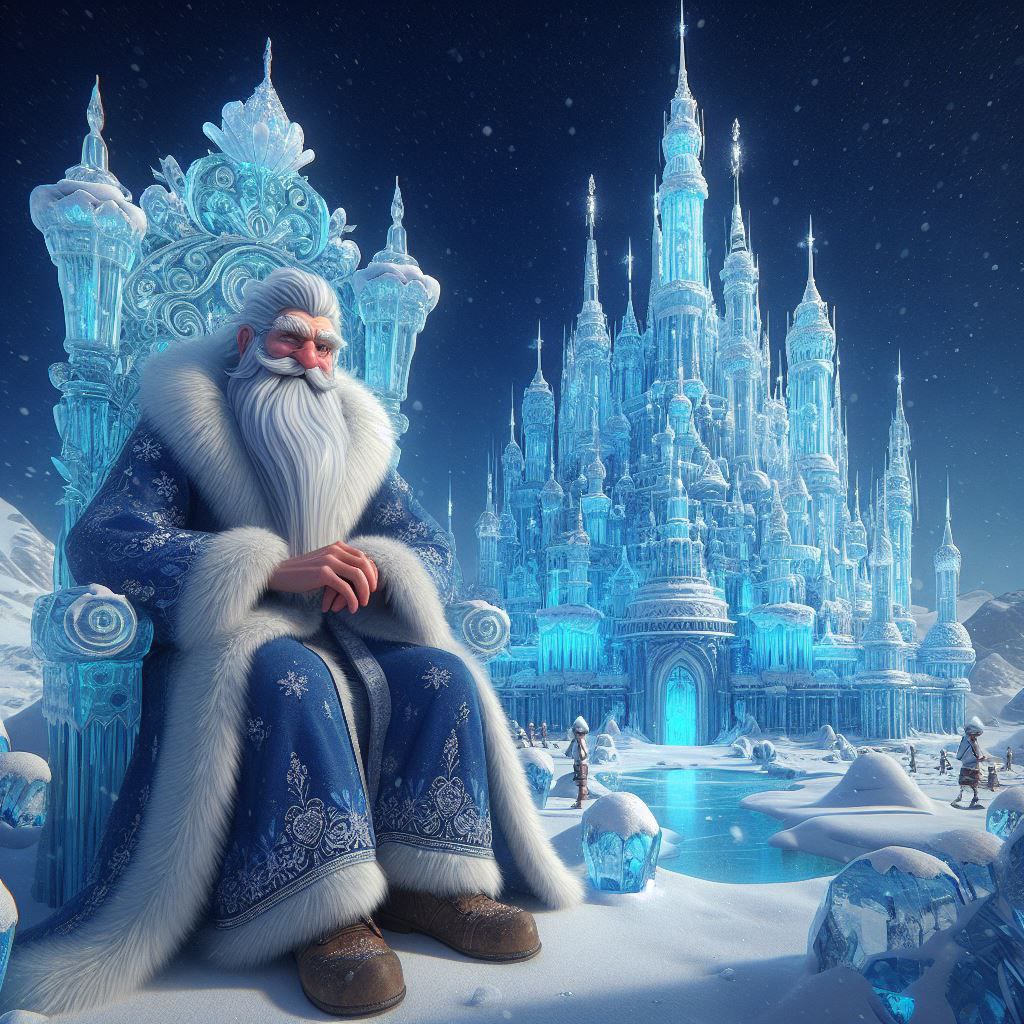 Наконец, поднявшись на самую вершину горы, друзья увидели удивительное зрелище – там среди снегов высился величественный хрустальный дворец! А рядом восседал на троне изо льда сам Мерлин с длинной седой бородой, одетый в голубые одежды, усыпанные снежинками.