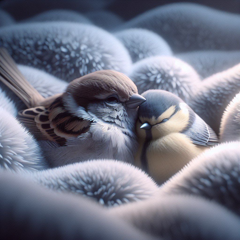 Синицы, с их яркими сине-желтыми перьями и веселыми трелями, тоже готовятся к ночи. Они собираются вместе, обмениваются историями о дне и медленно улетают в свои гнезда. Они укладываются спать, прижимаясь друг к другу для тепла, и засыпают под звуки ночного леса.
