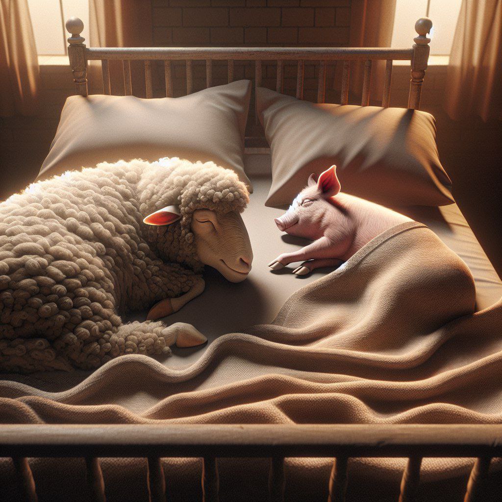 Свинки, с их розовыми круглыми телами и веселыми хрюканьями, тоже готовятся к ночи. Они собираются вместе, обмениваются историями о дне и медленно уходят в свои стойла. Они укладываются спать, прижимаясь друг к другу для тепла, и засыпают под звуки ночной фермы.