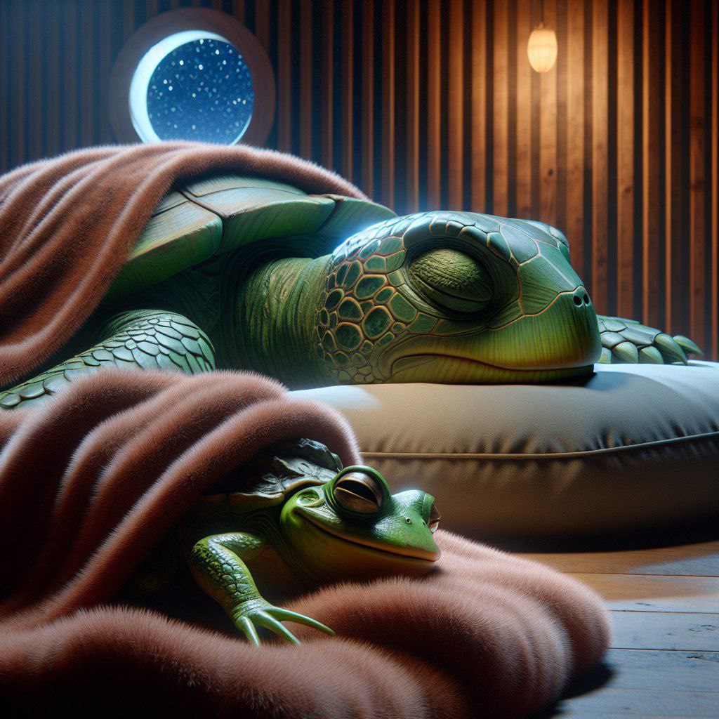 Черепахи, с их твердыми панцирями и медленными движениями, начинают свои подготовительные ритуалы. Они медленно возвращаются на свои камни, где они любят спать. Мама-черепаха проверяет своих детенышей, убеждается, что они все на месте, и укладывает их спать. Она поет им песню на ночь, мягкую и успокаивающую, и малыши черепахи засыпают, уютно устроившись на своих камнях.