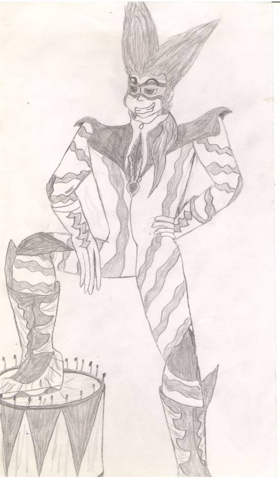Ураган застыл и оказался гигантским попугаем. Нет, все же человеком весьма странного вида, в высоких сапогах и экзотической одежде. Обтягивающий костюм в пурпурно-жёлтую полоску, стильные перчатки того же цвета. На кистях его рук – красно-фиолетовые браслеты. Плечи были неестественно высокими (скорее всего это часть костюма), а в довершении «попугайного оперения» на голове красовалась высокая зелёная шляпа без полей, вдавленная посередине. Из-под нее выбивался тонкий конский хвост черных волос.