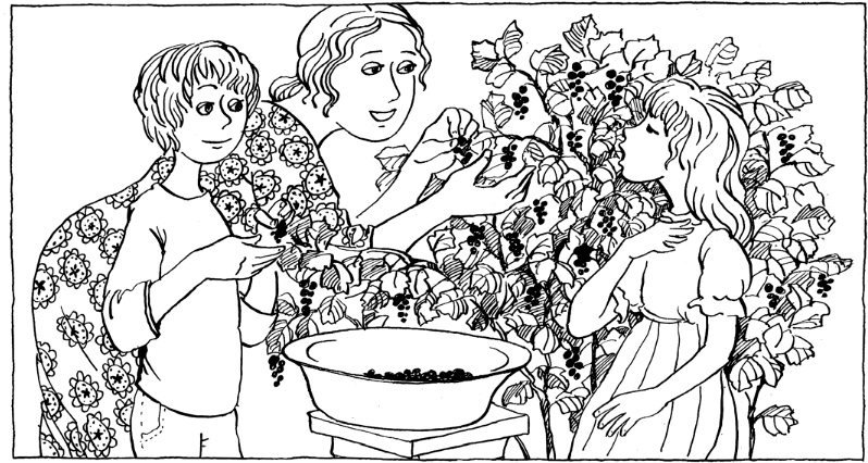 Возле забора мама с Никитой обирали с кустов смородины спелые ягоды и складывали их в большой белый таз.