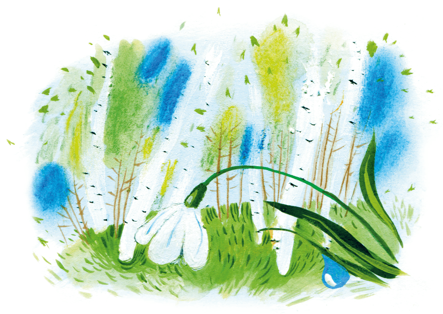 И вдруг у дальнего оврага шустро прошмыгнул маленький зверёк. Грудка у него была вся белая, будто на неё налипли снежинки, а спинка рыжеватая, точно беличья. «Это же Ласка сменила зимний мех! – сообразил Малыш Барсук. – Всю зиму она была снежно-белой, а теперь сияет янтарным блеском».