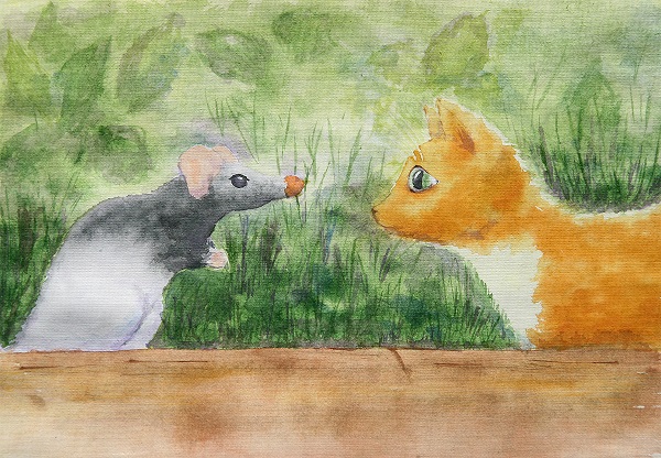 Молодая рыжая кошка, опустив голову и сглатывая слюну, сидела на веранде старенького деревенского домика. Запах жареных котлет кружил ей голову. Громко шурша, подошла большая серая крыса и села рядышком. Кошка даже ухом не повела.