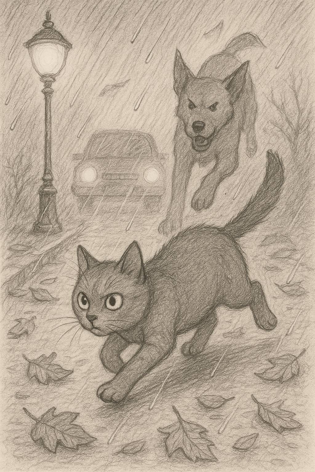 Мохнатый упитанный пёс преследовал Урагана уже второй квартал. «Бумажные сосиски! Так бежать можно до бесконечности!» – подумал Ураган и нырнул за угол. Он остановился, развернулся и выскочил навстречу псу, зашипел и ударил его лапой по носу. Пёс опешил, присел от неожиданности, а через секунду ринулся в атаку.