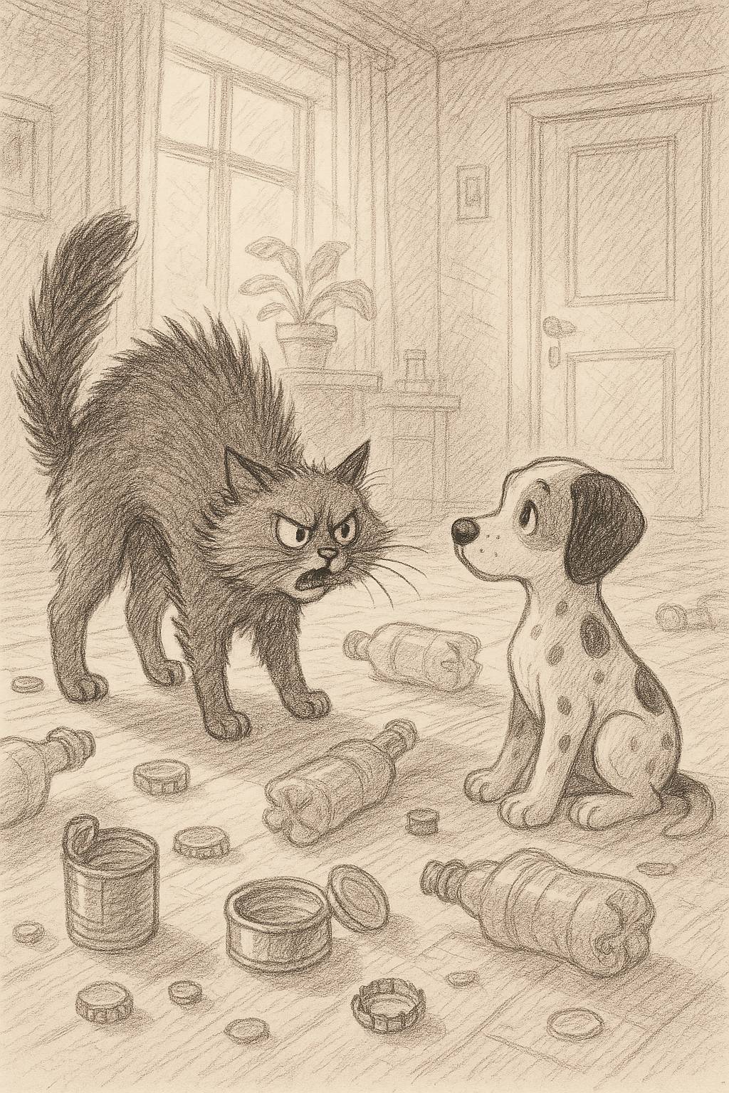 – Барсук, кто это раскидал?! – воскликнула хозяйка, глядя на поваленные баки и разбросанный мусор.