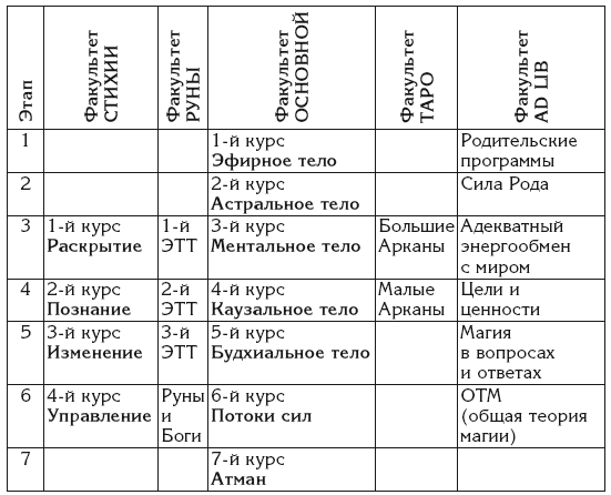 На данном факультете идёт последовательное развитие сознания человека. В ходе обучения высвобождаются скрытые энергетические резервы для последующей распаковки информационных пластов психики. Основа работы – это семеричная структура сознания, которая включает в себя физическое тело и б тонких тел, расположенных в строгом иерархическом порядке. Каждое тонкое тело выполняет определённую задачу.