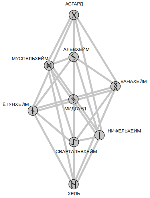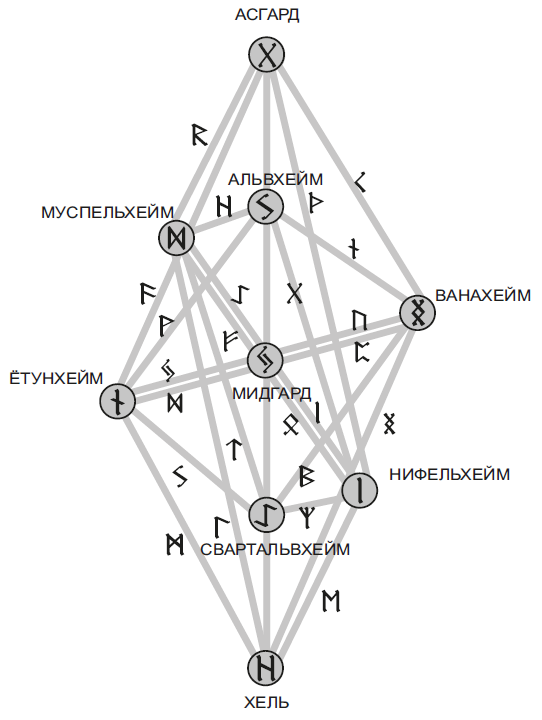 И четыре оленя,рога запрокинув,гложут побеги:Даин и Двалин,Дунейр и Дуратрор.Глупцу не понять,сколько ползает змейпод ясенем Иггдрасиль:Гоин и Моин —Граввитнира дети, —Грабак и Граввёллуд,Офнир и Свафнир, —они постоянноясень грызут.Не ведают люди,какие невзгодыу ясеня Иггдрасиль:корни ест Нидхёгг,макушку – олень,ствол гибнет от гнили.(Старшая Эдда. Речи Гримнира)Девять миров связаны между собой каналами-рунами, и каждый канал работает на специфической частоте. Эта частота соответствует определённой руне футарка, которые вы уже познали и пропустили через себя.