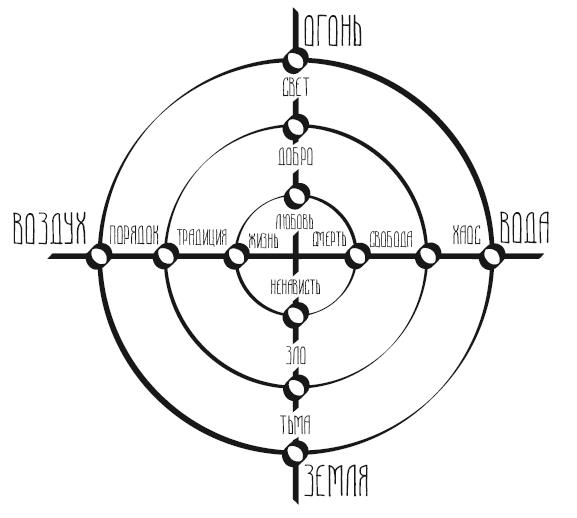 Правило второе: внешний круг силы (первоосновы Порядок-Хаос-Свет-Тьма) не может напрямую управлять третьим кругом (первоосновы Жизнь-Смерть-Любовь-Ненависть), а только опосредованно через средний круг, прокладку (первоосновы Традиция-Свобода-Добро-Зло).