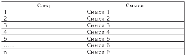 Для этого необходимо, глядя на каждый выявленный смысл (табл. 16 шага 2), спросить себя: «А в каких ещё моих следах проявляется этот смысл?» И продолжить логическую линию: