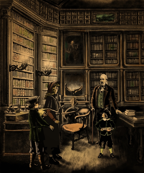 Да, тут было на что посмотреть! Тёмная витрина вдруг засветилась, и на ней стал виден занавес – точно в театре. Занавес пополз вверх, и нашим взорам открылась изумительная картина: витрина представляла миниатюрную комнатку с мебелью и книгами; ещё там стоял стол со свечой, мягкие кресла. На одном из кресел лежал рыжий кот – он, казалось, дремал, но его прищуренные изумрудные глаза пристально следили за нами. По комнате сновали несколько мальчиков в одинаковых одеждах: один смахивал пыль, другой складывал книги, третий перебирал что-то в нарядных крошечных коробочках, четвёртый почтительно протянул на подносе стакан с чаем… почтенному седому старичку, что сидел в кресле с книгой в руках. Старичок кивком поблагодарил мальчика, взял стакан, отхлебнул – затем повернул голову и взглянул прямо на нас! Он улыбнулся, спокойно и приветливо, будто старым знакомым – и точно, я тут же узнала его! Борис не ошибся: это был тот самый старичок, встреченный нами в Летнем саду. Я стояла, ошарашенно уставившись на витрину, затем перевела взгляд на брата и удивилась: Борис смотрел на старичка и улыбался ему в ответ!