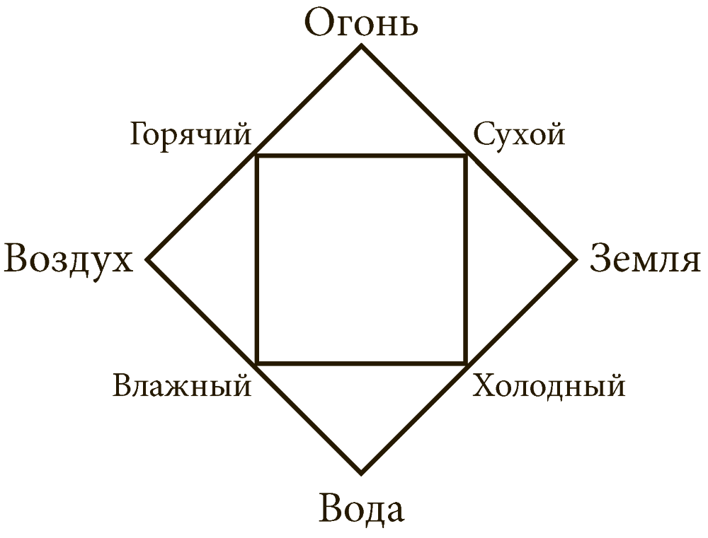 С древних времен Огонь и Воздух считались активными и деятельными (мужскими) стихиями, олицетворяющими легкость, в то время как Земля и Вода – пассивными, тяжелыми, инертными, податливыми (женскими). В китайской философии многое построено на этих противоположностях – ян (огонь и воздух) и инь (земля и вода). В буддизме четыре стихии ассоциировались со светом (огонь), воздухом (ветром), твердостью (земля) и текучестью (вода). В работах Галена и Гиппократа четыре элемента связывали с четырьмя основными биологическими соками организма и типами темперамента: холерическим (огонь), сангвиническим (воздух), флегматическим (вода) и меланхолическим (земля). Средневековый астролог и врач Парацельс отмечал, что каждая природная стихия управляется своим духом: саламандры – это духи Огня, ундины – духи Воды, гномы – духи Земли, а сильфиды – духи Воздуха.