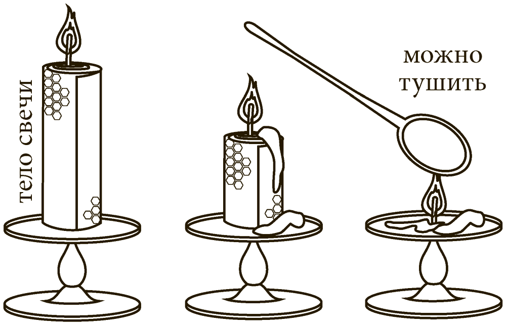 • Очень важное правило: не тушите свечу водой и не задувайте пламя! Вода может закипеть и брызнуть во все стороны, попав вам в лицо. Если же вы будете дуть на свечу, то пламя может вас обжечь, ведь огонь от притока воздуха разгорается еще больше. Чем же можно тушить огонь? Стихией земли. Она включает в себя все материальное, все физические объекты. Тоненькую свечку можно потушить просто пальцами. Это не больно, у нее очень маленький фитилек. Большие свечи, которые горят мощным пламенем, лучше тушить ложкой. Если вы хотите присыпать чем-то свечу, то идеальный вариант – это земля, песок или обычный стиральный порошок. (Это крайняя мера, если нужно срочно потушить разгоревшуюся свечу, не доводите до этого, иначе весь ритуал придется повторять с самого начала.)