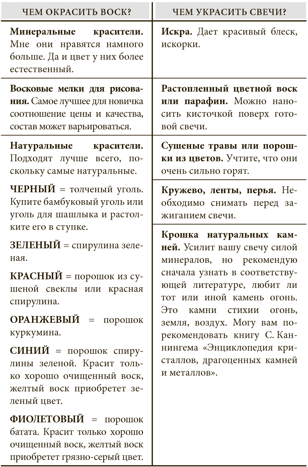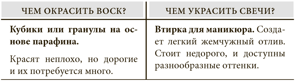 Окрашивание свечейДля начинающих мастеров свечного дела я рекомендую приобрести большой набор восковых мелков, ими удобнее всего пользоваться на первых порах, именно они дадут «тот самый» цвет. Достаточно небольшого кусочка мелка (около 1 см), чтобы прокрасить одну, две или даже три свечи. Ниже вы найдете список красителей для вашего творчества. Самая большая сложность у нас возникает, пожалуй, с белыми цветами и с холодными оттенками. Воск сам по себе имеет желтоватый теплый оттенок, поэтому придать свече белый, голубой, синий или фиолетовый цвет не так просто, поскольку очень сложно избавиться от естественной желтизны воска. Вспомним школьные уроки рисования: желтый + синий = зеленый. Таким образом, чтобы получить нужный вам оттенок, необходимо либо очистить воск от примесей до почти белого цвета, либо купить уже очищенный воск, который, правда, в два раза дороже неочищенного. Можно также сначала окрасить желтый воск в белый цвет (например, минеральным красителем), а потом с помощью мелков – в фиолетовый. В итоге получим свечи холодных оттенков.
