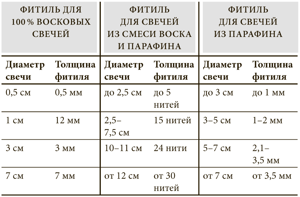 Я пользуюсь белым хлопковым фитилем-косичкой, а также джутовым: обычный джутовый шпагат 1 мм толщиной, который можно купить в любом хозяйственном магазине. Раньше я пробовала льняные и пеньковые фитили, но именно джутовый и хлопковый – мои фавориты. Посмотрите таблицу и подберите нужную вам толщину фитиля. Если фитиль будет слишком тонким, то пламя свечи «захлебнется» в воске и погаснет, а если слишком толстым, то свеча прогорит очень быстро. Чтобы увеличить толщину фитиля, скрутите его в два слоя. В продаже есть фитили, состоящие из нескольких нитей. Они чаще всего используются для свечей из смеси воска и парафина.